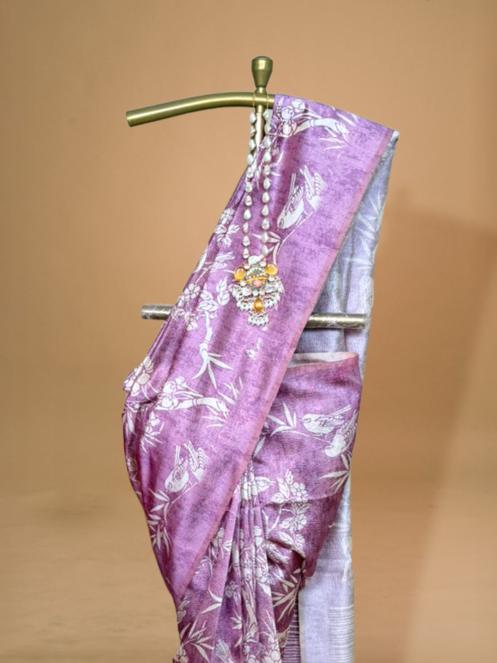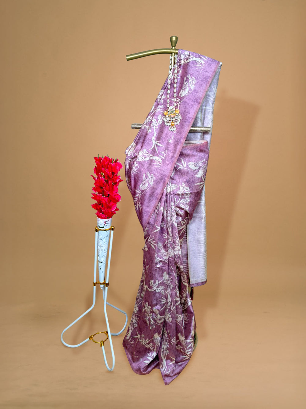 Elegant Art Silk Saree with Birds Print – Beige & Magenta Shades