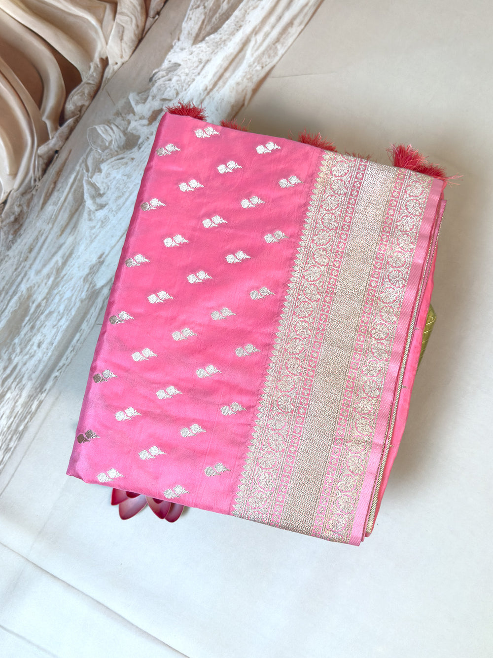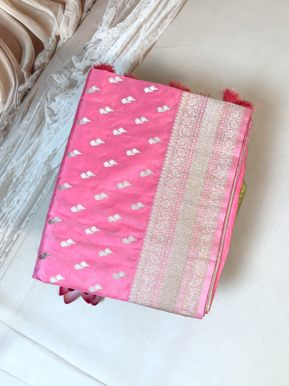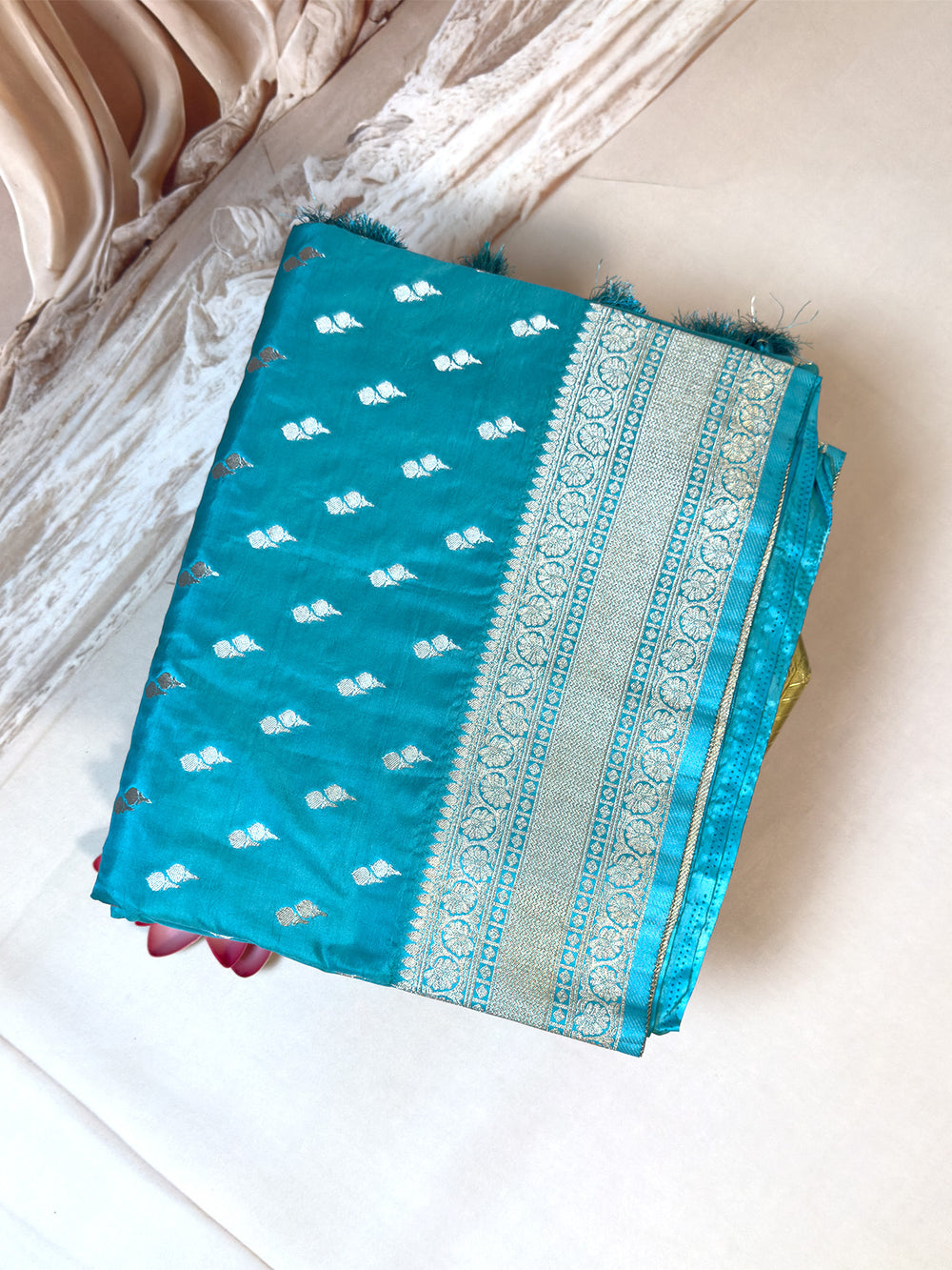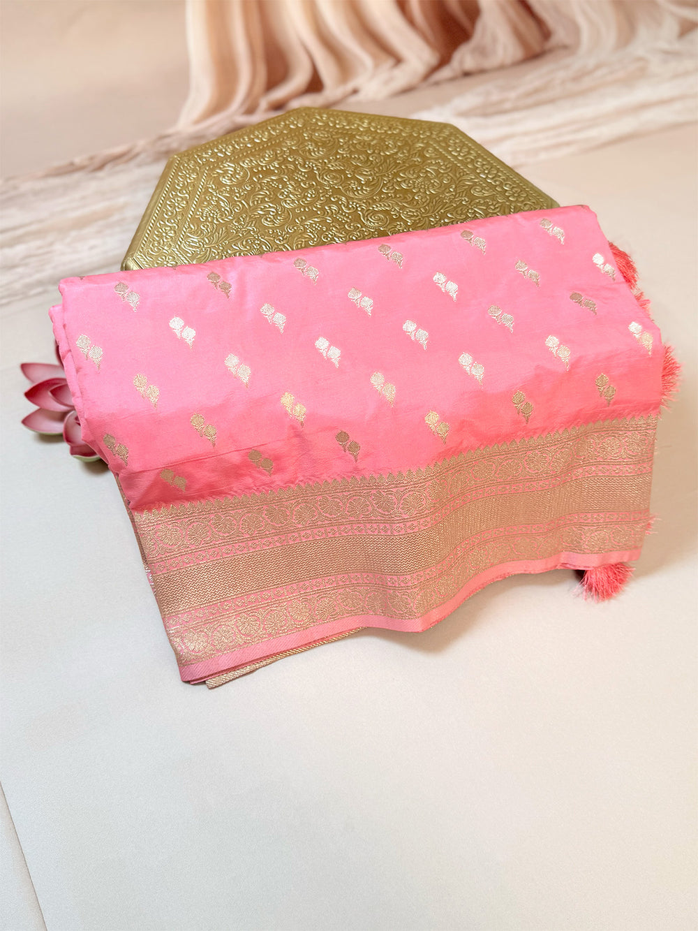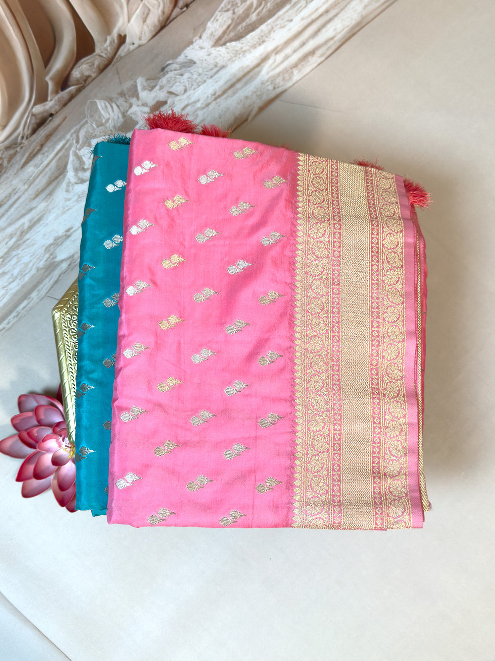 An exquisite dupion Banarasi silk saree adorned with gold and antique zari buta weaving. Crafted in a unique designer concept, this saree exudes a high-end, sophisticated look. Comes with a matching running blouse for a complete ensemble.
