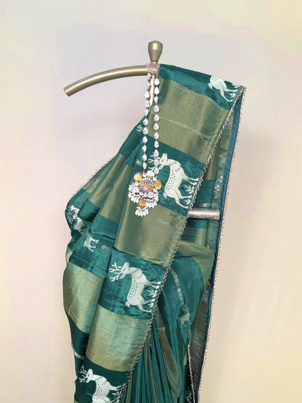 This Bottle Green Banarasi Munga Silk Saree is designed with golden stripes running throughout and beautifully aligned deer motifs that add a touch of artistic charm. The arrangement of the motifs brings a stylish and refined look. It is paired with a matching running blouse, making it an effortless yet regal ensemble.