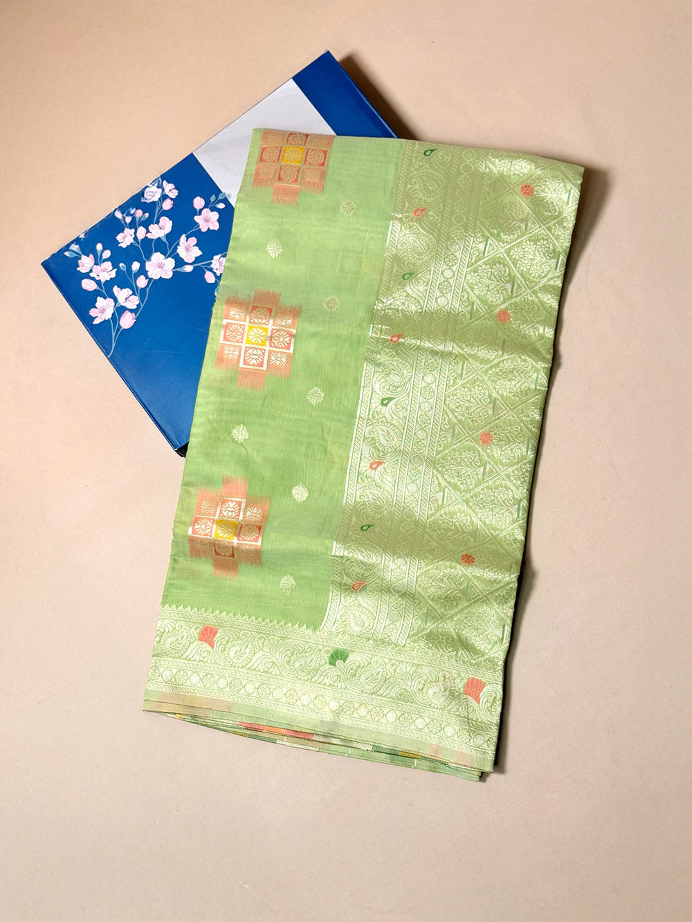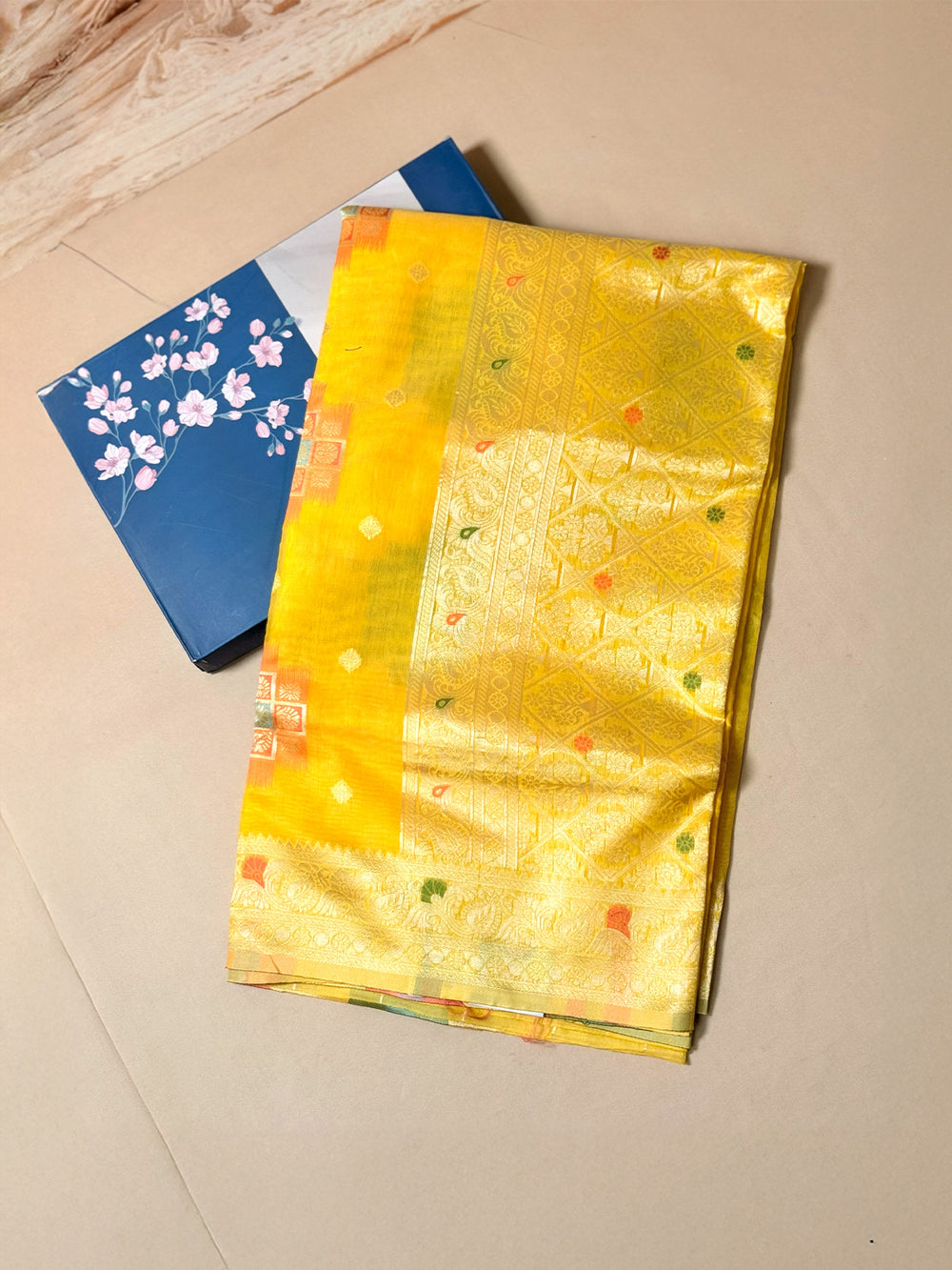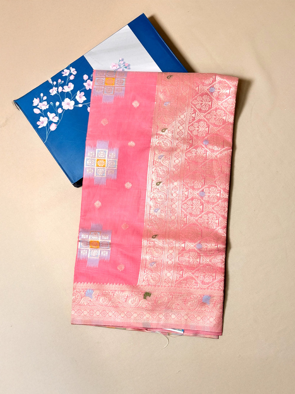 This exquisite Pure Banarasi Brocade Saree is intricately woven with rich zari designs, showcasing fine craftsmanship and traditional artistry. The elegant orange hue beautifully enhances the brocade detailing, making it a timeless drape for festive and traditional occasions. It comes with a matching running blouse for a complete regal look.