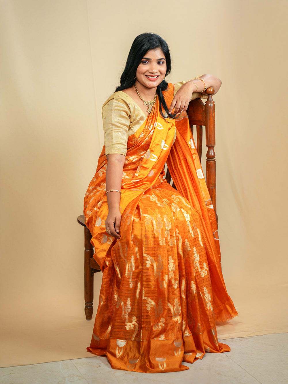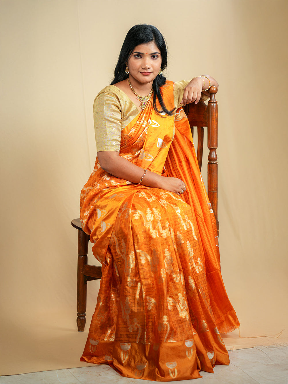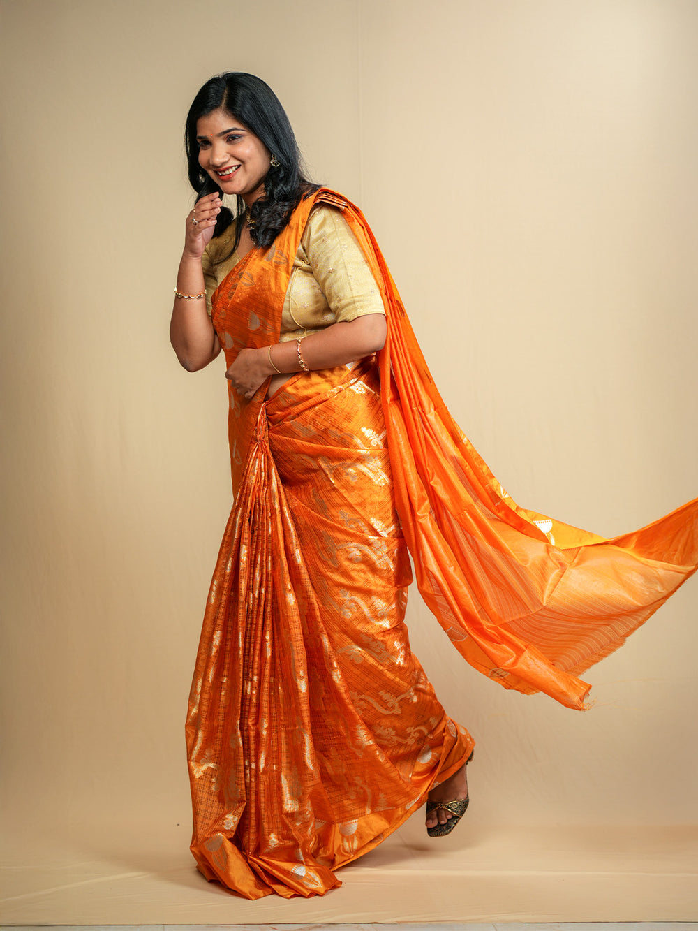 This elegant Banarasi Chinon saree features beautiful golden zari weaving, complemented by a stylish satin border with designer butas. The fabric is extremely light and feather-soft, making it perfect for comfortable festive wear. Comes with a matching running blouse.