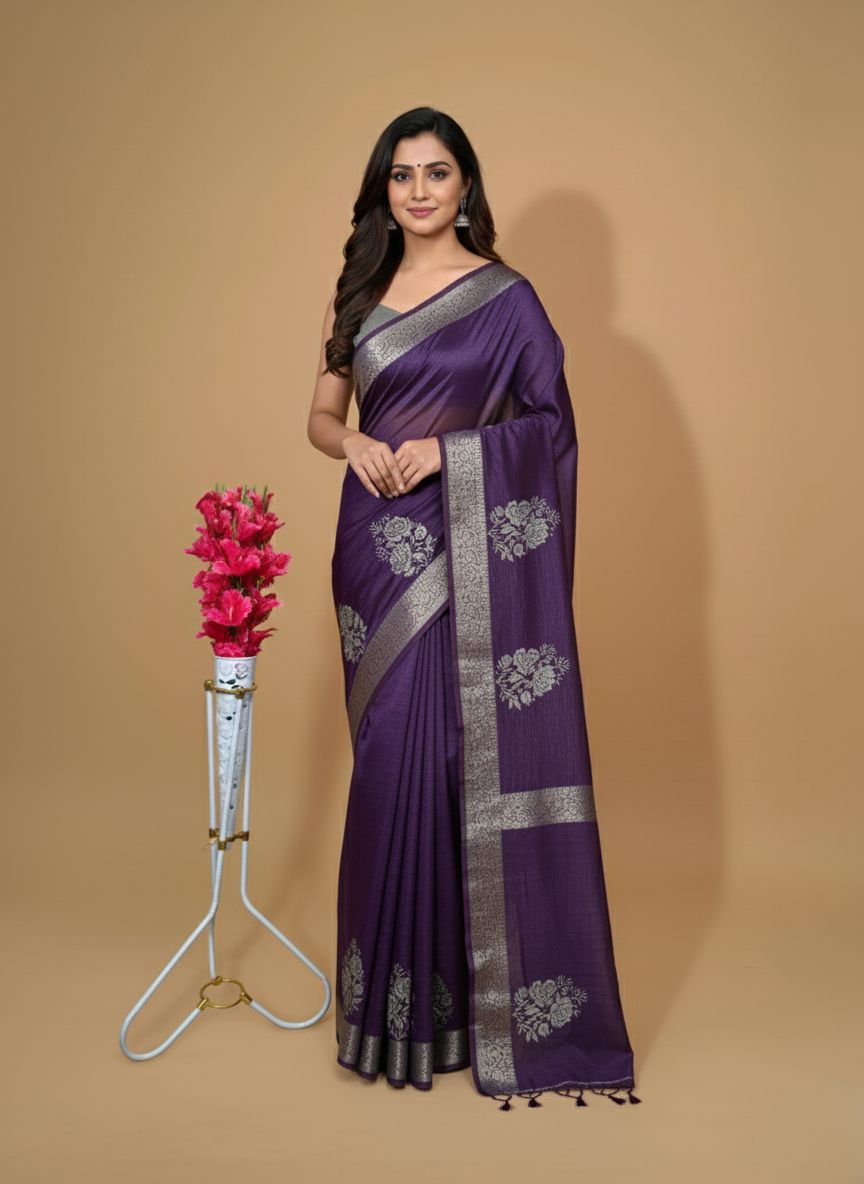 A luxurious crushed tissue silk saree adorned with delicate floral bunch embroidery all over. This saree is exceptionally lightweight, making it easy to drape and carry. Its royal appearance adds an elegant touch, perfect for special occasions. Comes with a matching running blouse for a complete look.