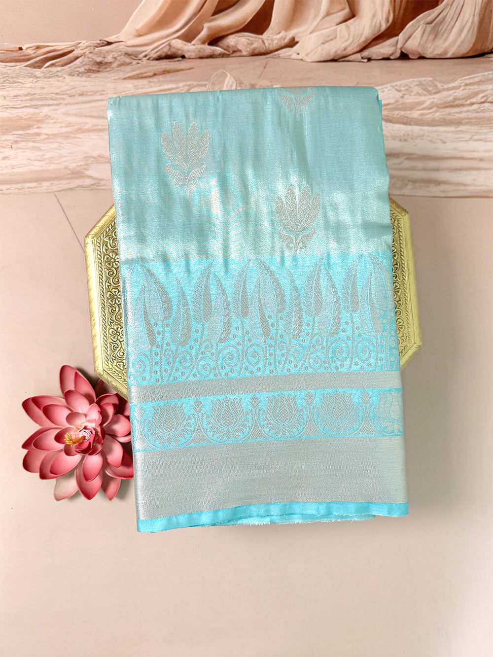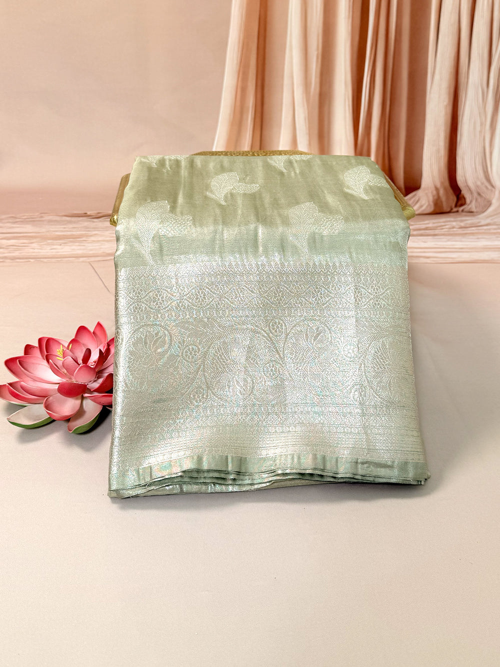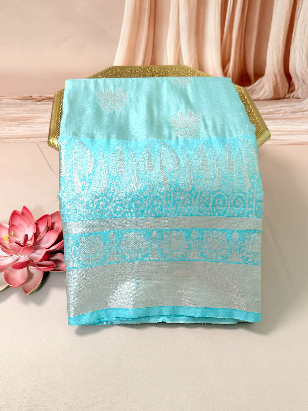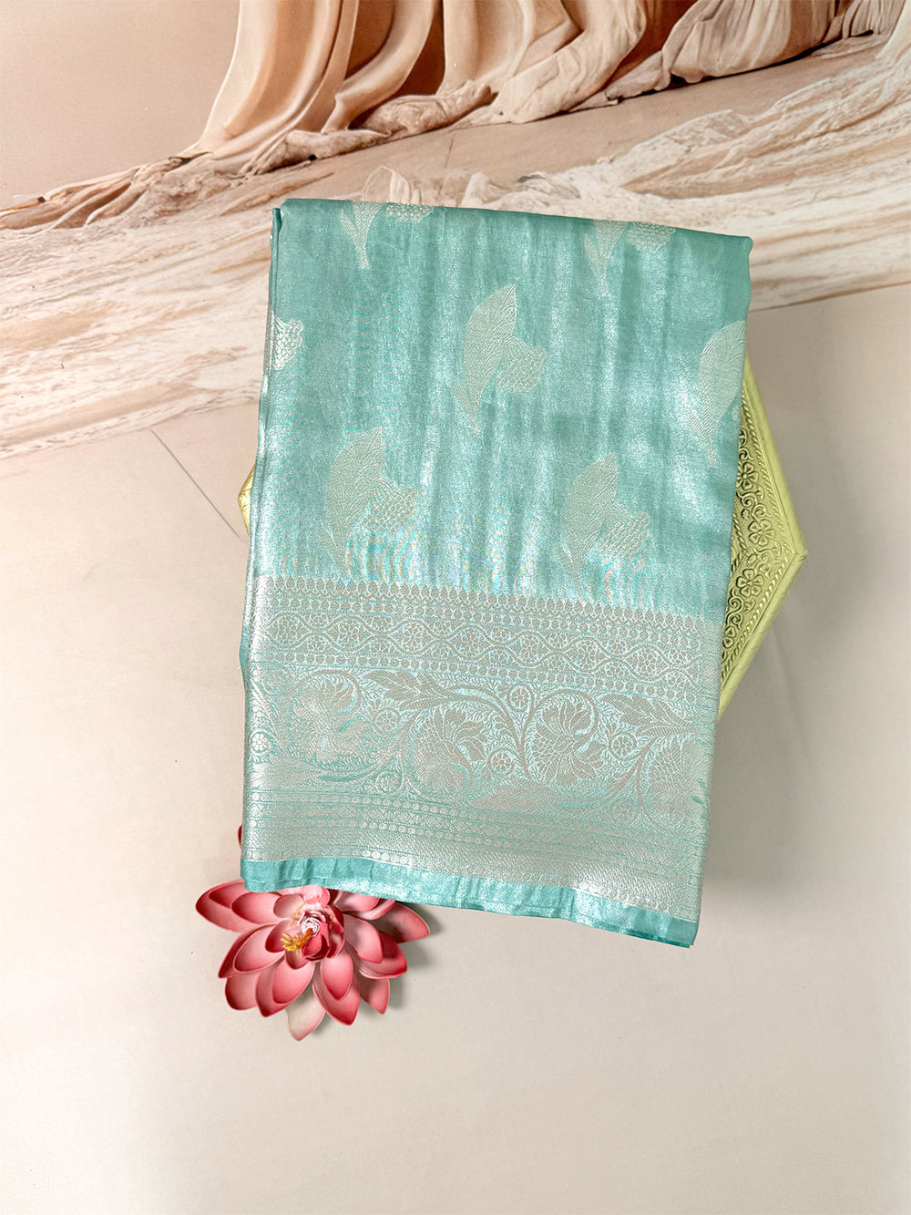Crafted from the finest Banaras Tanchui, this saree features rich and intricate self-weaving with a unique designer concept. Known for its luxurious texture, this Tanchui saree is paired with a running blouse, making it a timeless addition to your ethnic collection.