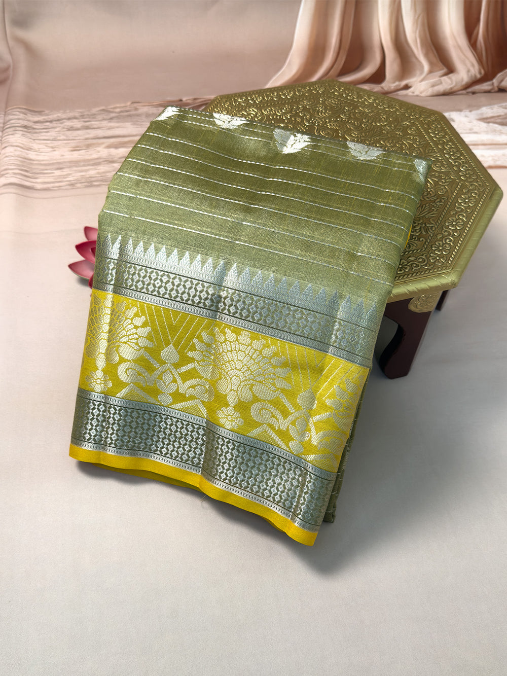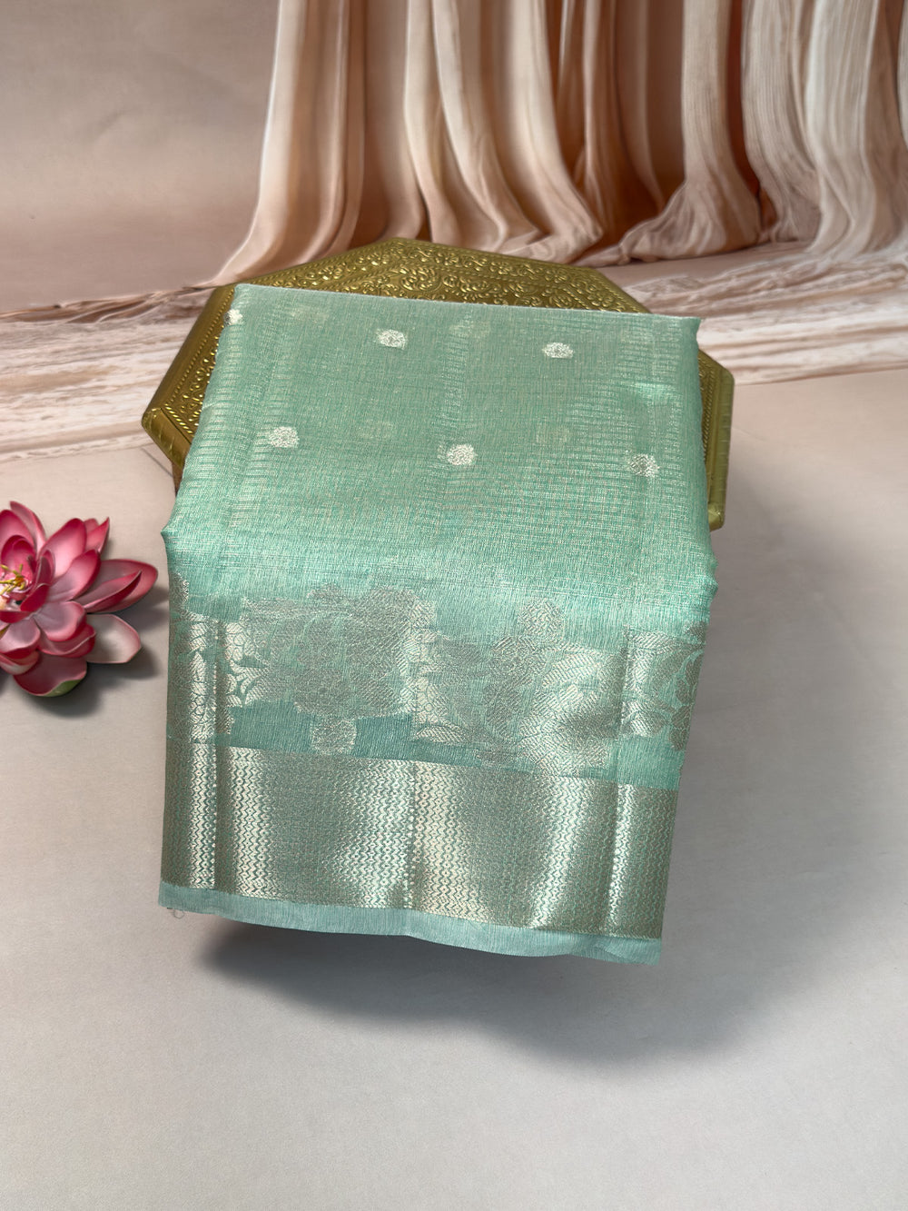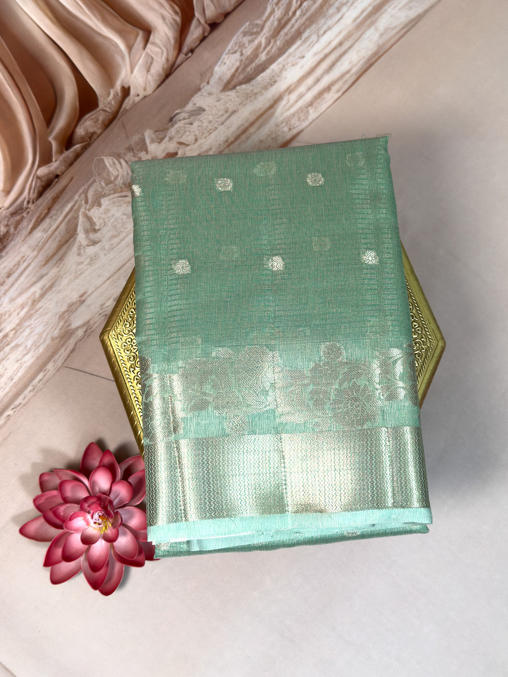 Elegant pure Kota silk saree in a soothing peach shade, designed with a grand zari border. The saree includes a matching running blouse, making it perfect for weddings, traditional occasions, and festive wear.
