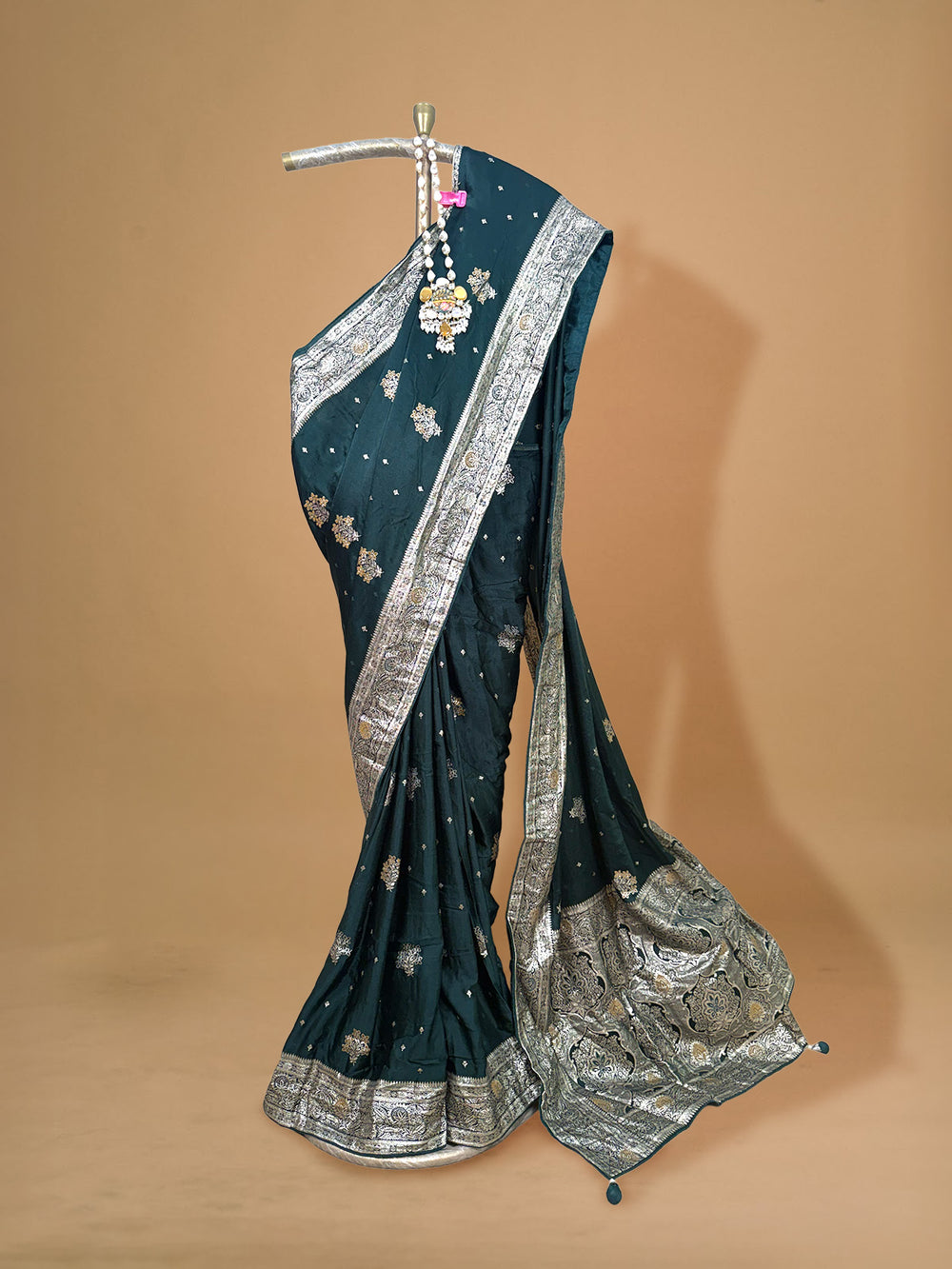 Originating from Banaras, this Mashroo Silk Saree blends the luxury of satin with traditional golden zari and fine thread motifs. Known for its body-hugging drape and graceful fall, the fabric feels incredibly soft and elegant, delivering a royal charm with every wear. Lightweight and easy to carry, this saree is perfect for those who appreciate timeless elegance with a touch of heritage.