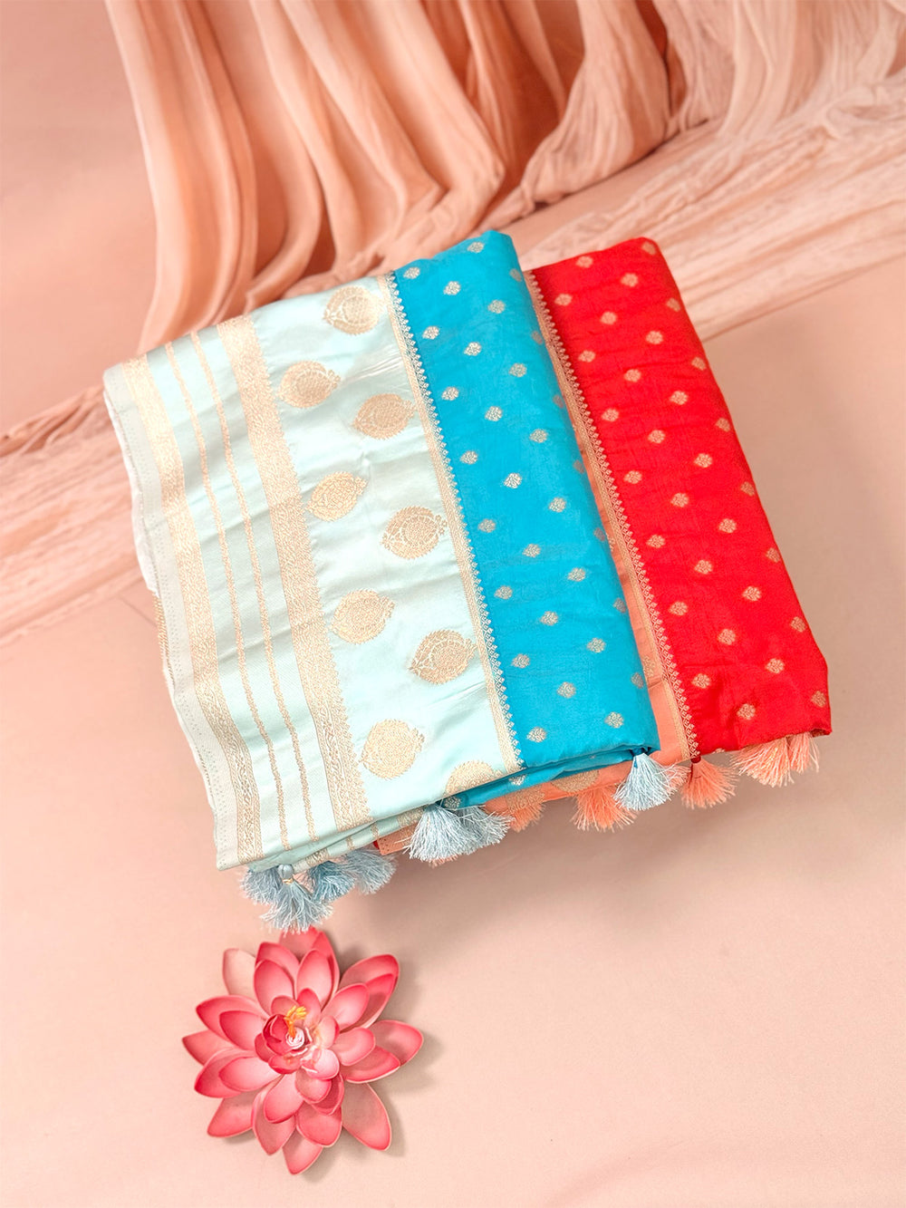 This elegant Mushroom silk saree is beautifully adorned with gold zari weaved butas all over the body. The satin border adds a smooth, refined touch, making it an ideal choice for festive occasions and traditional gatherings.