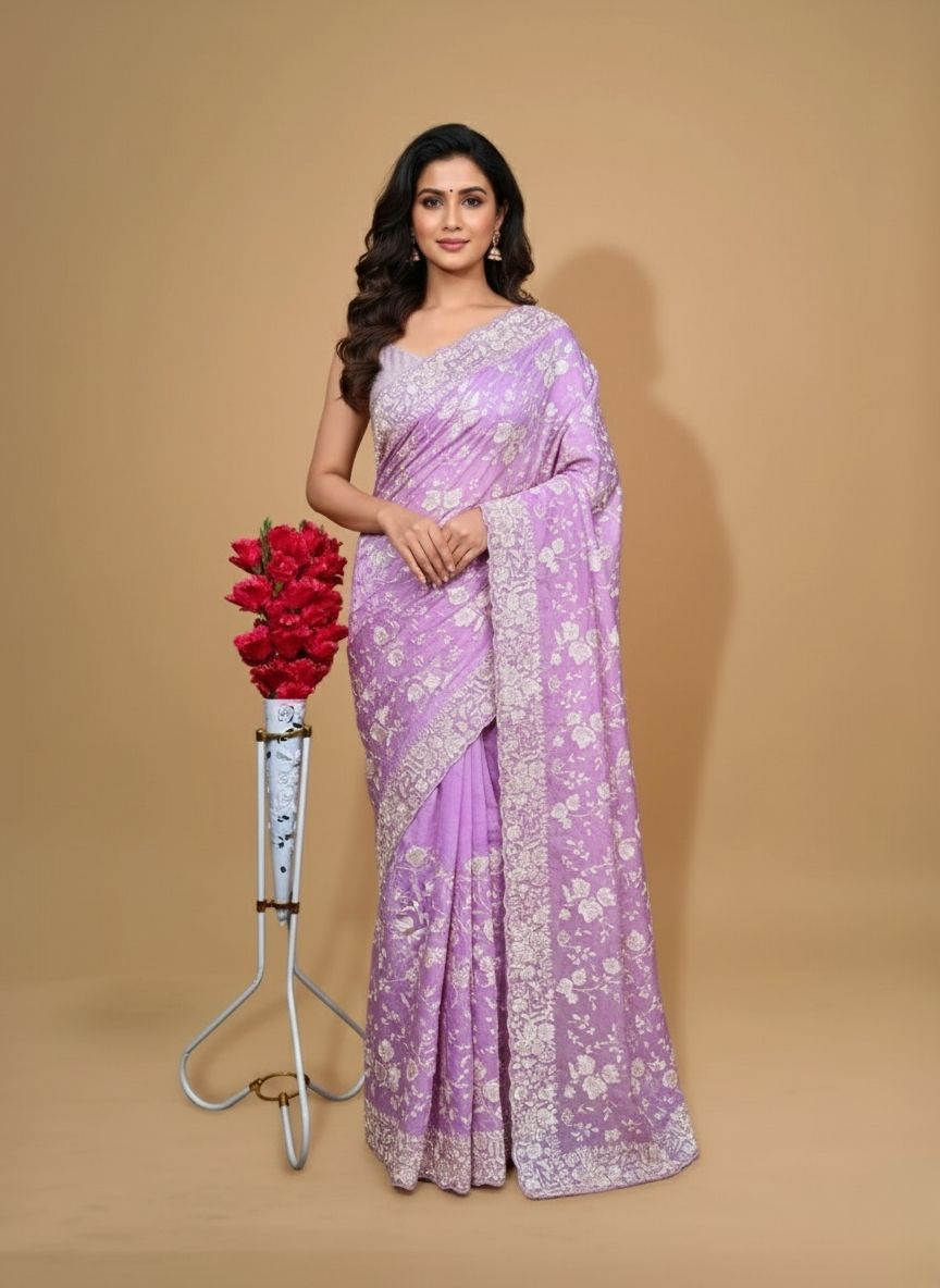 This stunning Lilac Linen-Shaded Organza Saree features intricate Chikankari thread embroidery that adds a refined charm. The lilac shade blended with white embroidery creates a soft, elegant contrast, giving the saree a classic and royal appearance.