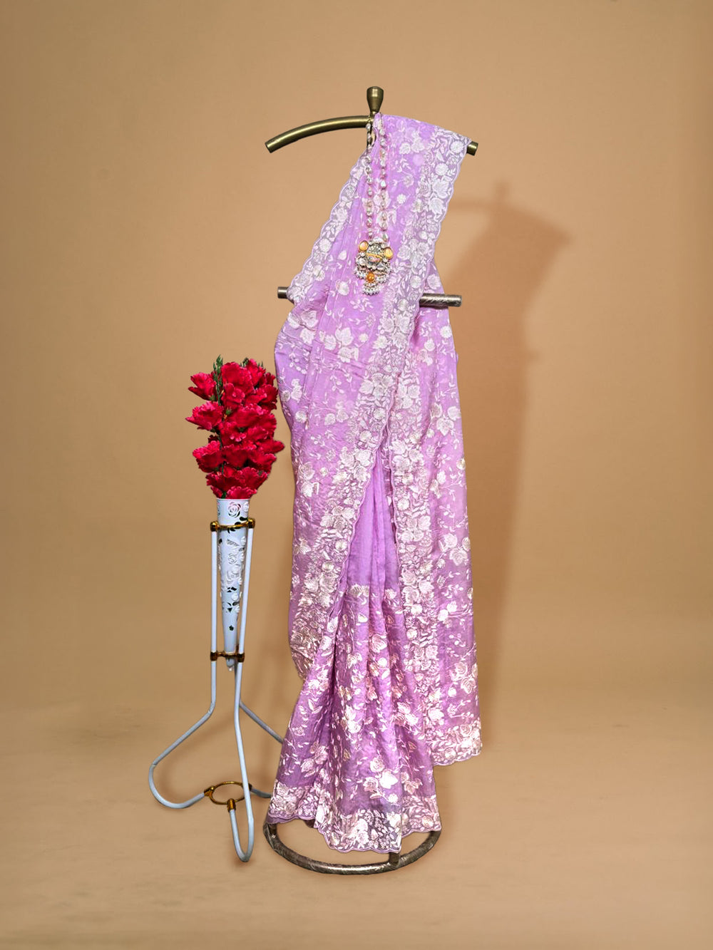 Lilac linen-shaded organza with white Chikankari thread embroidery.