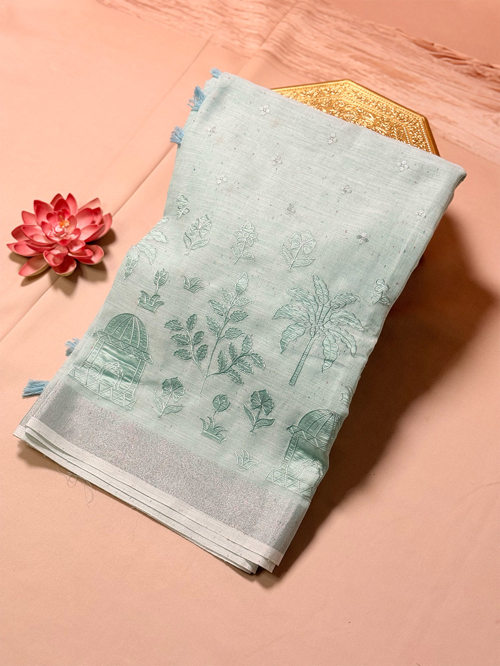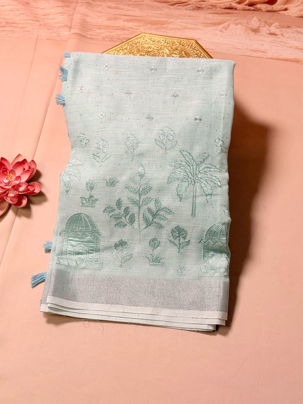 Pure Handloom Linen Saree with Self-Colour Appliqué Work