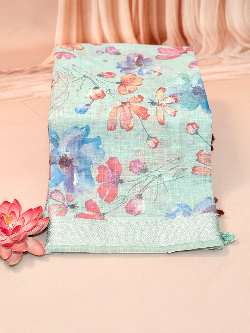 Pure Linen Saree with Digital Floral Print and Silver Zari Border