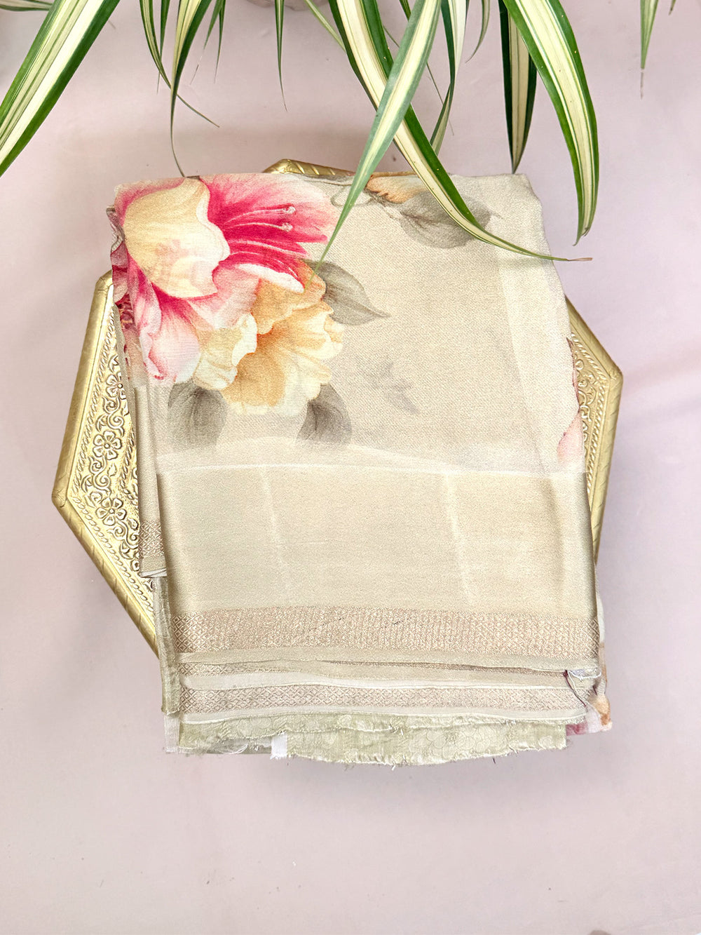 Pure Satin Georgette Saree in Light Pista Green with Floral Prints