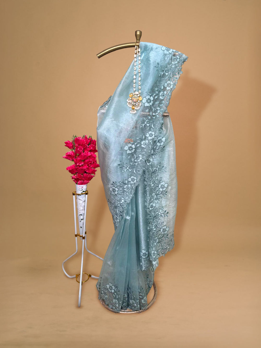 This Teal Green Shaded Shimmer Organza Saree is a graceful blend of contemporary style and traditional finesse. The saree features beautifully handcrafted cutwork along the borders, creating a refined and eye-catching edge. Its lightweight shimmer fabric brings a subtle glow when worn, making it ideal for festive and party occasions.