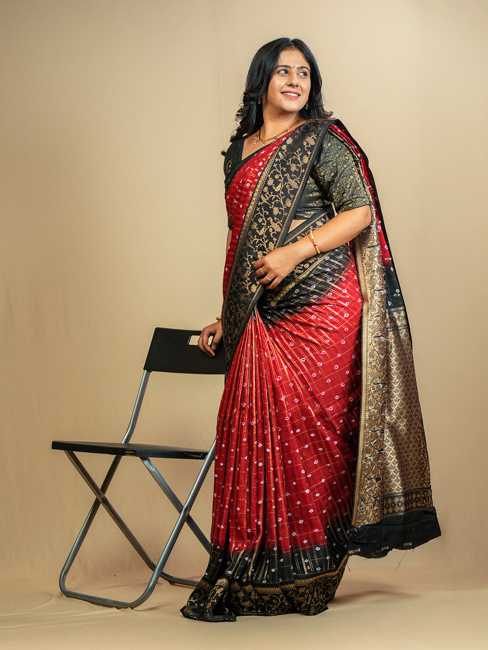 This elegant Tussar Bandini saree features beautiful Bandini work with refined zari weaving lines and a rich golden woven border on a contrast black base. The saree offers a sophisticated and elegant look. Comes with a matching running blouse.